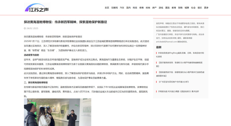 2025年2月24日,江苏之声报道我院寒假社会实践团队赴江苏盐城黄海湿地博物馆开展采访实践活动,报道内容如下:探访黄海湿地博物馆:传承新四军精神,探索湿地保护新路径2025年1月17日,江苏师范大学传媒与影视学院寒假社会实践团队前往位于江苏盐城的黄海湿地博物馆进行采访实践活动。此次活动旨在通过实地探访,深入了解湿地保护的重要性,并结合新四军精神,探讨在新时代背景下如何更好地传承和弘扬这一宝贵精神财富,用“铁军魂”锻造“生态绿”,为湿地保护事业注入新的活力。一、活动背景与目的近年来,全球气候变化和生态环境问题愈发严峻,湿地保护成为全球关注焦点。黄海湿地作为重要生态系统,对维护生态平衡、促进可持续发展至关重要。江苏盐城黄海湿地博物馆作为首个全面展示黄海湿地主题的博物馆,兼具教育与宣传功能,并借助现代展示手段展现湿地保护的科学研究成果。此次实践活动,通过探访黄海湿地博物馆,深入了解湿地保护的现状与挑战,并探讨科学保护方法。同时,结合新四军精神,激励青年学子体悟革命先辈的奋斗精神,增强责任感与使命感,为湿地保护事业贡献青春力量。二、探访黄海湿地博物馆在传媒与影视学院党委副书记张存钊、副教授张陈杰及辅导员鹿璐的带领下,实践队下午1时抵达盐城黄海湿地博物馆。该博物馆坐落于范公路东侧、建军路南、通榆河西、青年路北,占地1.6万平方米,巧妙融合盐城火车站的城市记忆与拱形建筑特色,展现新风貌。在博物馆讲解员的引导下,实践队参观了主展区,分为“海陆天成”“天际旅程”“河海交响”“湿地家园”“全球使命·中国担当”五大主题。展区运用丰富展品与多媒体手段,生动展示了黄海湿地的自然美景、生物多样性及保护意义,包括抹香鲸、丹顶鹤、麋鹿等标本,以及湿地、鸟类栖息地、海滩等景观。同时,博物馆的数字沙盘、全息展演、沉浸式体验及动态监测平台等交互项目,让观众深切感受湿地的独特魅力。三、采访湿地保护专家为了深入了解湿地保护的科学研究和实践成果,实践队采访了黄海湿地博物馆的自然教育导师束雪琪。束老师向实践队详细介绍了黄海湿地的生态特征、保护现状以及面临的挑战。并指出黄海湿地作为全球重要的生态系统之一,拥有丰富的生物多样性和独特的自然景观,对于维护生态平衡、促进可持续发展具有重要意义。然而,随着人类活动的不断增加和气候变化的影响,黄海湿地面临着严重的威胁和挑战。因此,加强湿地保护,维护生态平衡,已成为当务之急。作为博物馆的工作人员,她参与了大丰建川鸟类友好型种养殖基地生态修复项目:“大丰建川鸟类友好型种养殖基地,经过生态修复,将传统的精养鱼塘恢复为适合珍稀动植物生长的生态湿地。往年,从北方来盐城的丹顶鹤一般在遗产地北部(YS-2)核心区越冬。科研人员于 2023 年冬天首次在建川养殖基地观测到野生丹顶鹤,今年观测到的数量已达到50多只,这是历史上从来没有过的。”她向实践队介绍了湿地保护的科学方法和技术手段。湿地保护需要综合运用生态学、地理学、环境科学等多学科的知识和技术手段,通过恢复湿地植被、控制污染源、加强监测和管理等措施,有效保护湿地的生态功能和生物多样性。同时,还需要加强公众教育和宣传,提高公众对湿地保护的认识和意识,形成全社会共同保护湿地的良好氛围。 四、结合新四军精神,探讨湿地保护新路径盐城不仅以广袤无垠的湿地资源而著称,更承载着光辉璀璨的新四军精神。博物馆讲解员生动地讲解揭示了湿地保护所面临的艰巨挑战,强调了政府、企业、社会组织及个人合作的重要性,共同守护这片珍贵的自然资源。实践队伍在探访中深刻感悟到新四军精神的丰富内涵,认为其在新时代对湿地保护等生态文明建设具有宝贵的指引作用。他们表示,新四军精神中的坚定信念、团结合作、英勇无畏和坚韧不拔,正是湿地保护事业所需要的品质。博物馆宣传策划部部长江俊波向实践队讲述了“十八勇士”的感人故事,1965年,这十八位勇士在盐碱荒滩上治理盐碱、植树造林,为生态复苏带来了希望。江部长指出,新时代湿地保护需要创新思路,加强科研、技术应用和公众教育,形成全社会共同保护湿地的良好氛围,并借鉴国际经验,共同推动湿地保护事业向前发展。实践队伍深受启发,表示将秉承新四军精神,积极探索湿地保护的新路径、新方法,为构建人与自然和谐共生的美好家园贡献青春力量。在黄海湿地博物馆的深入探访之后,实践队深受“十八勇士”传奇故事与新四军精神的触动与鼓舞。成员们纷纷立下誓言,要将这份宝贵的精神遗产转化为实际行动,积极投身于生态文明建设的伟大事业中,携手共筑绿色未来,让黄海湿地在新时代焕发出更加璀璨的绿色光芒。(撰稿:沈心怡)(拍摄:陈良舟)(采访:周婧怡)报道网址链接:http://jszs.xznqc.cn/guonei/11589.html