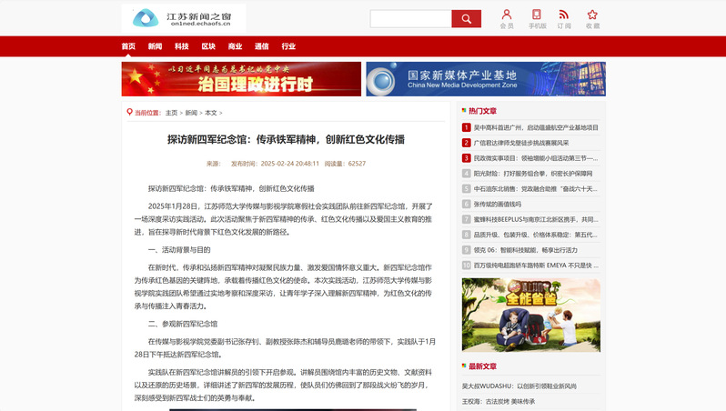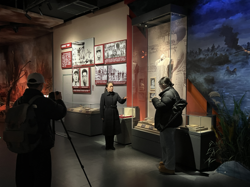 2025年2月24日,中国江苏网报道我院寒假社会实践团队前往新四军纪念馆开展采访实践活动,报道内容如下:探访新四军纪念馆:传承铁军精神,创新红色文化传播2025年1月28日,江苏师范大学传媒与影视学院寒假社会实践团队前往新四军纪念馆,开展了一场深度采访实践活动。此次活动聚焦于新四军精神的传承、红色文化传播以及爱国主义教育的推进,旨在探寻新时代背景下红色文化发展的新路径。一、活动背景与目的在新时代,传承和弘扬新四军精神对凝聚民族力量、激发爱国情怀意义重大。新四军纪念馆作为传承红色基因的关键阵地,承载着传播红色文化的使命。本次实践活动,江苏师范大学传媒与影视学院实践团队希望通过实地考察和深度采访,让青年学子深入理解新四军精神,为红色文化的传承与传播注入青春活力。二、参观新四军纪念馆在传媒与影视学院党委副书记张存钊、副教授张陈杰和辅导员鹿璐老师的带领下,实践队于1月28日下午抵达新四军纪念馆。实践队在新四军纪念馆讲解员的引领下开启参观。讲解员围绕馆内丰富的历史文物、文献资料以及还原的历史场景,详细讲述了新四军的发展历程,使队员们仿佛回到了那段战火纷飞的岁月,深刻感受到新四军战士们的英勇与奉献。三、采访纪念馆工作人员为深入了解新四军纪念馆在传承红色基因和开展爱国主义教育方面的工作,实践队采访了纪念馆宣传负责人社教服务部的朱建勇。针对“新四军纪念馆在新时代如何通过具体的活动和形式,让铁军精神更好地传承下去,特别是在青少年中进行爱国主义教育”这一问题,朱建勇介绍,纪念馆打造了“行走的思政课堂”,与多所高校合作推动大中小学思政课一体化建设,像与南京大学联合创新思政育人模式,还举办了“红动沪盐”“红动馆校”等主题活动,开展“一件旗袍的追思”等艺术思政课,全年开展近百场,让学生与革命先辈实现“跨越时空的交流”。此外,纪念馆在文艺精品创作和文创品牌打造上成果丰硕,制作了一系列新四军故事视频,排演了情景剧,研发了“铁军红”系列文创产品,在各地亮相时收获热烈反响。在回答“新四军纪念馆在传承‘铁军魂’方面做了哪些创新尝试,这些举措如何帮助参观者更好地理解和感受这一精神”时,朱建勇表示,纪念馆完成了基本展陈优化提升,在展陈中运用了习近平总书记在新四军纪念馆参观时的视频和论述;成功创成国家一级博物馆;硬件设施也提档升级,如完成旧址修缮、建成铁军剧场、更新讲解设备、推出线上预约系统等,极大提升了观众的参观体验对于红色文化数字化建设相关问题,朱建勇提到,纪念馆建成发布了“智享”新四军红色文化数据库三期,致力于打造公益性共享平台。未来计划开放新四军数字资源中心(第一期),在数字服务平台开设“馆校合作服务‘大思政课’”专栏,推出AR/VR沉浸式体验,强化社交媒体内容策划,举办各类线上活动,吸引更多年轻人参与。在回应“新四军历史上的英雄事迹对今天的人们有哪些激励作用,纪念馆如何通过这些事迹来弘扬铁军精神”时,朱建勇以刘老庄连为例,讲述了全连82人壮烈殉国的英勇事迹。她强调,这些英雄事迹激励着人们坚定信念、勇往直前。纪念馆通过讲述英雄故事、举办主题展览等方式,让参观者深刻感受铁军精神。四、探寻红色文化传播新路径参观和采访结束后,实践队对新四军精神有了更深刻的理解。队员们认识到,传承和弘扬新四军精神是当代青年的重要使命。未来纪念馆将深化“N+”文创品牌建设,挖掘更多文化价值,开发特色文创产品。同时加强与文旅部门合作,打造红色旅游线路,让游客在体验中感受铁军精神。进一步加强红色教育与自然教育的融合,开展“红色文化与自然生态”主题活动,如举办科普讲座、自然艺术创作等,吸引更多青少年参与,培养他们对红色文化和自然生态的热爱。此次对新四军纪念馆的探访,让实践队深受鼓舞。队员们纷纷表示,将积极传播新四军精神,为红色文化传承贡献自己的力量,让铁军精神在新时代绽放光彩。(撰稿:沈心怡)(拍摄:陈良舟)(采访:周婧怡)报道网址链接:http://on1ned.echaofs.cn/xinwen/1160056.html