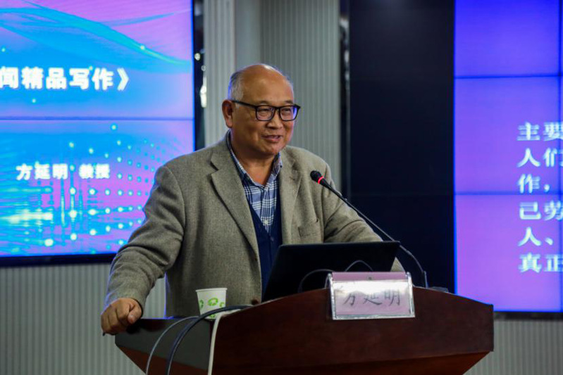 2019日4月29日下午三点,由传媒与影视学院、语言科学与艺术学院、人文社会科学研究院共同举办的《大学生人文素质与新闻精品写作》学术报告在云龙校区语科院四楼报告厅举行本次报告邀南京大学新闻传播学院首任院长、南京大学政府新闻学研究所所长、中国新闻奖、长江奖、韬奋奖评委、中国高校校报协会常务副理事长、中国新闻教育学会常务理事、中华全国新闻工作协会特邀主席方延明教授主讲,由传媒与影视学院张建强院长主持,相关专业教师、本科生和研究生一同聆听了教授的讲座。