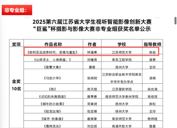 近日,第六届江苏省大学生视听智能影像创新大赛(原江苏省大学生摄影大赛)与第十六届“艺融杯”江苏艺术设计大赛获奖名单相继揭晓。传媒与影视学院学子在视听智能影像创新大赛中共斩获金奖1项、优秀奖3项;在“艺融杯”中共斩获银奖1项、铜奖2项。在本届江苏省大学生视听智能影像创新大赛中,钟濯寒同学的作品(指导教师:陈岩)荣获非专业组金奖;杨环毓同学(指导教师:朱斌)获短视频组优秀奖;由宋楠萍和孙灿小组、管可欣同学(指导教师:张超)提交的作品在人工智能影像组荣获优秀奖。在本届“艺融杯”中,由王新征老师指导,张家悦、王雨卉同学的AIGC作品荣获银奖;宋豪、沈杨、宋天宇同学的AIGC作品,以及管可欣、刘琦、冯敏捷同学的视觉传达作品分别荣获铜奖。据悉,这两场赛事均为省级认定赛事。江苏省大学生视听智能影像创新大赛旨在引导青年学子以智能影像技术参与社会实践,本届大赛共收到全省七十余所高校2900余组作品,类别涵盖短视频、纪实摄影、人工智能作品等7类。“艺融杯”旨在成为发掘优质设计作品、培育新锐设计人才的核心平台,本届大赛共收到参赛作品3598件,其中学生作品3292件,涵盖视觉传达、数字媒体AIGC等6大类别。(一审:佟彤,二审:张陈杰,三审:韩洪政)