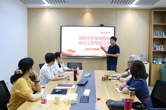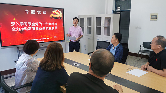 根据学校学习贯彻习近平新时代中国特色社会主义思想主题教育工作安排,7月上旬,传媒与影视学院党委领导班子成员分别到所联系党支部讲授专题党课,专题党课聚焦“学思想、强党性、重实践、建新功”总要求,注重与学习体会和实际工作相结合。 院党委书记赵永前以“新形势下高校宣传思想工作的挑战与应对”为主题,为广播电视学系党支部和行政实验党支部党员讲授专题党课。党课聚焦充分认识新形势下高校宣传思想工作的极端重要性、风险和挑战、路径和方法。党课强调,作为高校教师,要深入学习贯彻习近平总书记关于意识形态工作的重要论述精神,全面落实党中央关于意识形态工作的部署要求,贡献专业力量。 院党委副书记张存钊以“传承红色基因,争做时代新人”为主题,为本科生党支部和研究生党支部党员讲授专题党课。党课回顾运河支队和狼山阻击战79烈士的红色故事,重点解读了革命先烈为国家、为民族无私奉献的大无畏英雄精神。鼓励同学们树立大历史观,以对比的眼光回望历史、体悟当下,弘扬爱国奋斗精神,以青春之声致敬伟大时代。 副院长李忠以“新时代中国特色社会主义思想的三个维度”为主题,为广播电视艺术系党支部党员讲授专题党课。党课聚焦深入学习习近平新时代中国特色社会主义思想的政治维度、历史维度、理论维度,突出这一重要思想的道理学理哲理,倡导广大党员教师深刻增强历史自信和战略自信,深刻理解中国特色社会主义新时代的丰富内涵和理论意义。 副院长何靖以“深入学习领会党的二十大精神 全力推动教育事业高质量发展”为主题,为广告系党支部党员讲授专题党课。党课以习近平总书记在中共中央政治局第五次集体学习时的重要讲话精神为重要遵循,聚焦“教育高质量发展的主要特征”“坚定教育高质量发展的正确政治方向”“深化党建引领、协同各方构建高质量教育体系”三个方面。