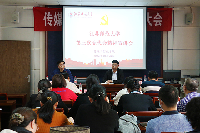 10月25日下午,传媒与影视学院召开贯彻落实校第三次党代会精神专题学习会,院领导班子成员、全体教职工出席会议,院党委书记赵永前作校第三次党代会精神宣讲。 赵永前结合党委工作报告和纪委工作报告,从“充分认识学习贯彻落实学校第三次党代会精神的重大意义”“深刻领会学校第三次党代会的精神实质”“联系实际把学校第三次党代会精神落到实处”“迅速营造学习贯彻落实学校第三次党代会精神的氛围”四个方面对校第三次党代会精神进行了解读和宣讲。他指出,校第三次党代会是在学校事业发展的关键时期召开的一次十分重要的大会,认真学习宣传贯彻校第三次党代会精神,是当前和今后一段时期的一项重要政治任务。他强调,传媒与影视学院党委将进一步提高政治站位、弘扬实干精神、注重学思践悟,全面深刻理解校第三次党代会报告的主要内容和实践要求、吃透内涵实质、领会核心要义、明确奋斗目标的基础上,聚焦学院中心工作,全面加强党的建设、人才培养、科学研究、学科建设、社会服务工作,凝心聚力、砥砺奋斗,推动学院事业实现新发展、新突破,为学校水平师范大学建设作出新贡献。