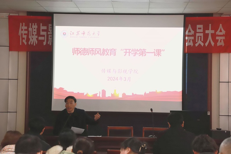 3月6日下午,传媒与影视学院在云龙校区6号楼304会议召开新学期全体教职工大会并开展师德师风教育“开学第一课”,院党委书记赵永前主持会议。会上,赵永前书记为全体教职工作师德师风专题教育“开学第一课”讲座,从三个方面就开展师德师风教育、绷紧“师德弦”、严守“师德关”进行了阐释:一是要坚持政治引领,树牢政治底线。作为传媒人才的培养者,要提高政治站位,把握正确方向,坚决维护意识形态安全;二是要坚持示范引领,做到身体力行。尤其是党员教师要亮明身份、擦亮标签、挺膺担当,坚持做到“让教育者先受教育”“让有信仰者讲信仰”;三是要坚持精神引领,提升思想格局。要将院风建设与师德师风建设有机融合,一体推进,全体教职工要提升个人修养,争做有情怀、有品味、有追求的教育工作者。学院领导班子成员围绕分管工作领域通报了近期工作情况和重点工作安排。赵永前书记作了总结讲话,传达了学校寒假和近期有关会议精神,解读了学校和学院本学期的工作安排,对党建工作、组织建设、师资队伍建设等工作作了重点强调和部署。
