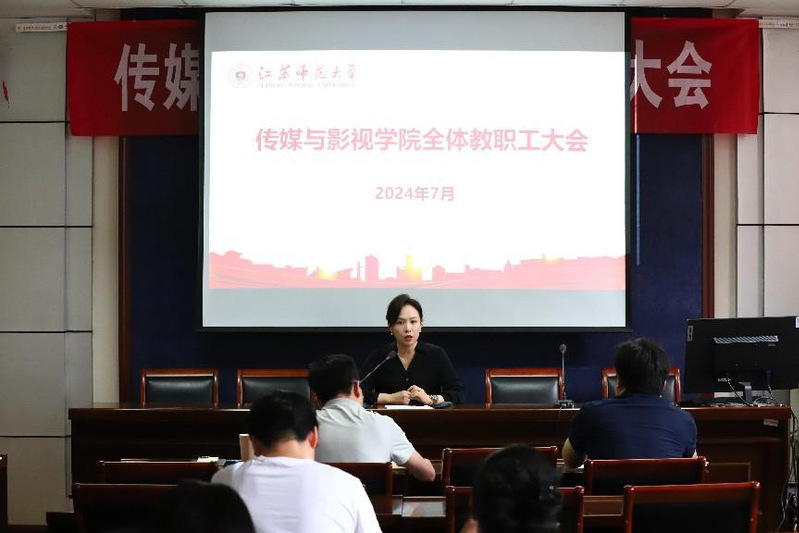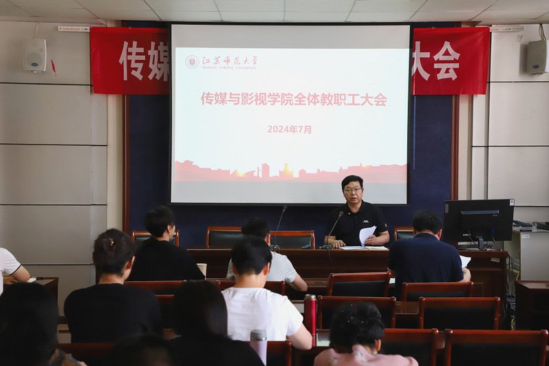 7月5日下午,传媒与影视学院召开全体教职工大会。会议由院党委书记杜昀主持。会上,各分管领导分别从教学管理、课程建设、教学参赛、安全教育、科研与研究生工作、学生就业等方面进行了通报,并布置暑期和下学期重点工作。院长孟宪浦传达了近期学校会议的相关精神,围绕学院目标任务书,对专业课程建设、教育教学审核评估、人才引进、招生录取工作等方面取得的成绩进行了总结。同时,就暑假期间及下半年重点工作进行了详细安排部署。他强调,全体教职工要始终牢记“教书育人”使命,把提高教学质量作为首要任务,不断深化专业课程建设,优化人才培养方案,努力提升人才培养质量。他要求,各系单位要围绕学院发展目标任务书,细化工作方案,明确责任分工,确保各项重点工作有序推进、有效落实。院党委书记杜昀从三个方面总结了学院党委近期开展的重点工作。一是严格推进落实党纪学习教育,通过多种形式将党纪学习教育抓细、落实;二是切实加强基层党支部建设,打基础,强功能,努力提升教工党支部在服务教师发展、推动专业建设、解决自身问题、加强内部管理能力和作风建设等方面的作用;三是完善落实议事决策制度,坚持分管负责、集体决策,以文件为依据,以制度为路径,以纪律为准绳,以促进事业发展为目标,提升工作的科学性,规范性。杜昀就暑期人才培养、制度建设、文化打造、教师发展等方面工作进行了强调和部署,详细解读《江苏师范大学教职工请假管理规定》和《江苏师范大学教职工因私出国(境)管理办法》等文件并强调了工作规范和纪律要求。(一审:周荃,二审:孟宪浦,三审:杜昀)