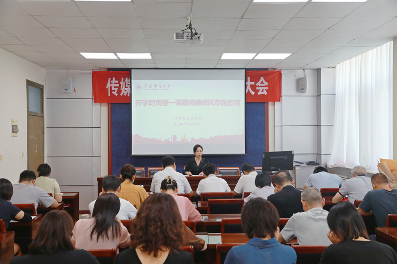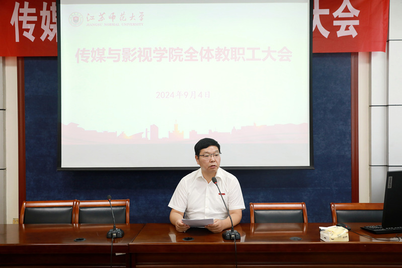 9月4日下午,传媒与影视学院召开“开学教育第一课”师德师风专题教育暨全体教职工大会。学院全体教职工参加会议。会议由院党委书记杜昀主持。杜昀为全体教职工作“开学教育第一课”师德师风专题教育,组织全体教职工深入学习《中共中央 国务院关于弘扬教育家精神加强新时代高素质专业化教师队伍建设的意见》,这是我国由教育大国向教育强国系统性跃升的关键历史节点上,对弘扬教育家精神、打造高素质专业化教师队伍作出的全面系统部署,是新时代新征程强教强师的纲领性文件,全体教职工要坚定心有大我、至诚报国的理想信念,积极践行教育家精神,涵养育人智慧,努力成为新时代高素质专业化的优秀教师。教育会上,杜昀结合学院工作对《新时代高校教师职业行为十项准则》和《江苏师范大学教师师德失范行为处理暂行办法》进行了重点解读和详细提醒。会上,院长孟宪浦传达了学校有关会议精神和下半年重点工作,回顾了学院2024年上半年及暑期的主要工作,总结了取得的成绩,并从人才培养、师资队伍建设、学术研究、国际化交流等方面对新学期重点工作进行了部署。孟宪浦强调,新学期学院将继续坚持立德树人根本任务,深化教育教学改革,加强师资队伍建设,推动学科交叉融合,提升学院整体办学实力和水平。杜昀指出,今年是学校发展历史上意义非凡的一年,对教职工们在学校重点工作突破中的积极努力、全力配合表示衷心的感谢,希望大家一是顺应学校发展要求,积极谋划个人发展高层次;二是顺应社会发展要求,主动作为服务社会强引领;三是顺应时代发展要求,深入思考学科建设高质量。在学院综合改革和高质量发展中同心同德,合聚力量,走出一条符合学院实际、彰显学院特色的创新发展之路。会上,学院领导班子成员分别就分管工作进行了通报和部署。(一审:周荃,二审:孟宪浦,三审:杜昀)
